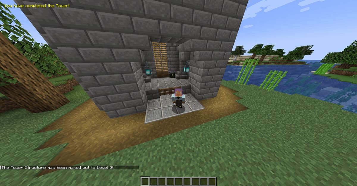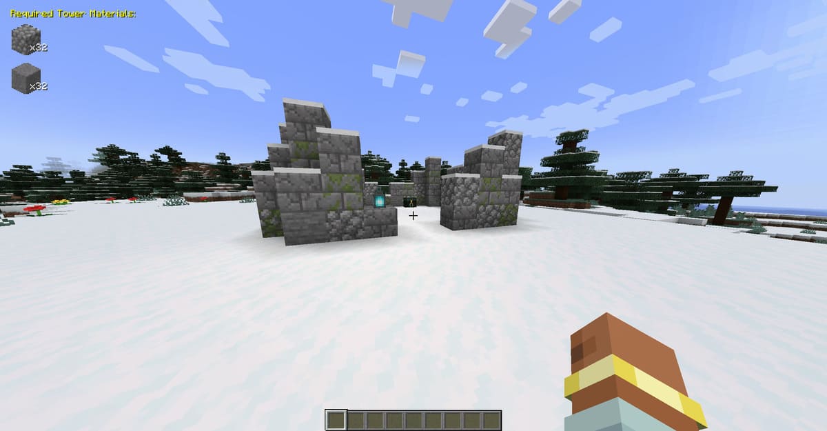 Всего будет несколько этапов, в которых нужно будет искать разные блоки и класть их в сундук, чтобы полностью достроить башню. Чтобы увидеть меню с ужными материалами, нужно чтобы худ был размером 3 и меньше. Можно вбить комаду /tower materials, чтобы увидеть необходимые для постройки блоки в чате.