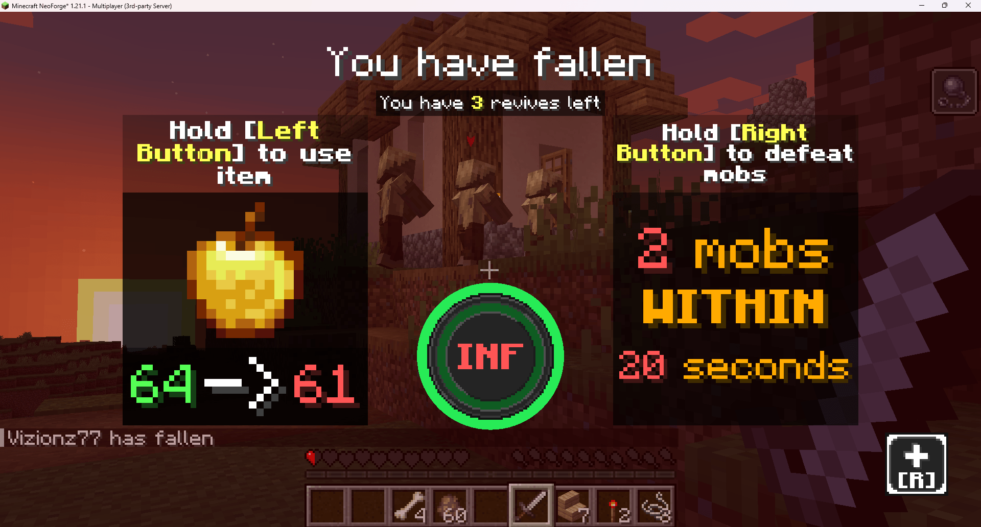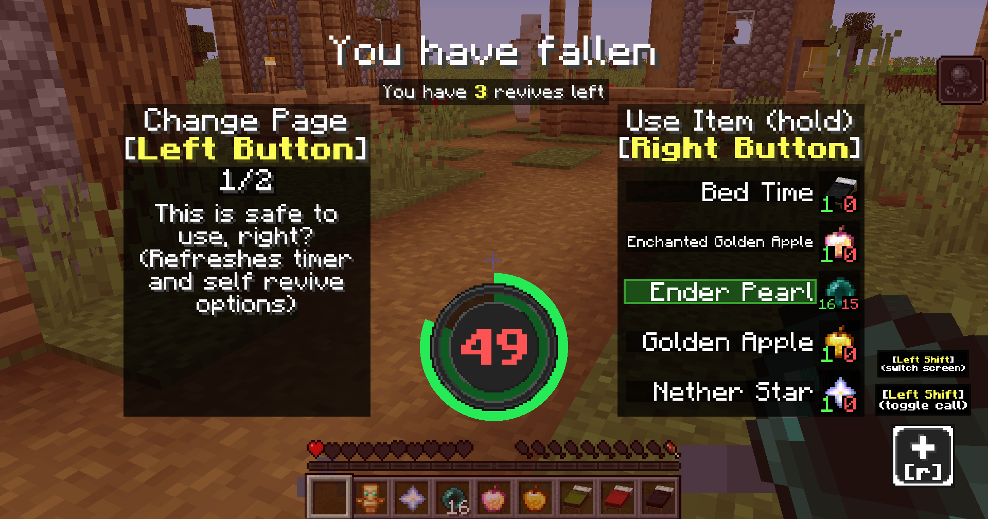 Revive Me! - Player Revival Mod - мод позволяет вам и другим игрокам воскресать после смерти, оплачивая возрождение ничем, либо ценой здоровья, опыта, еды, предметов или других ресурсов - всё зависит от настроек.