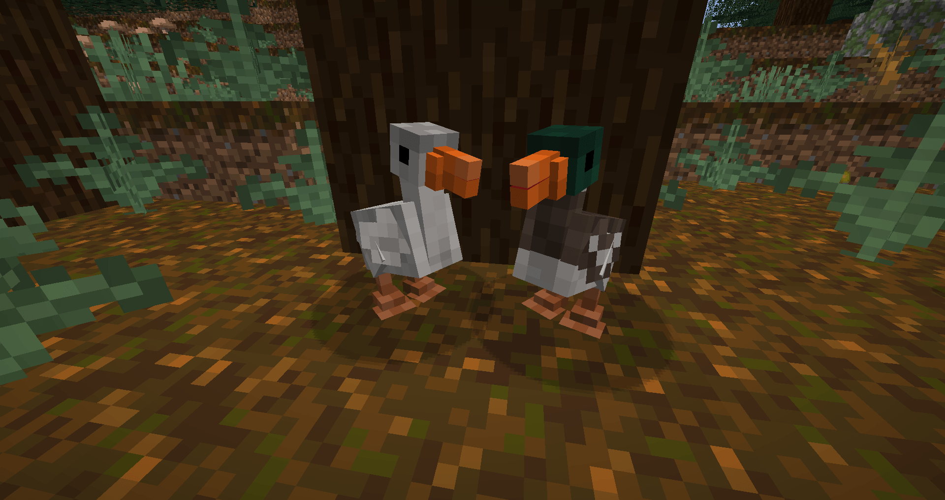 И у нас тут шуточный мод, основанный на страхе того, что шанс наблюдения за тобой утки никогда не равен нулю... Утки будут преследовать тебя на расстоянии, что достаточно крипово в некоторых ситуациях. Иногда об их появлении ты поймешь, услышав их кряканье. Существует всего три обычных варианта уток и очень редкая утка в солнцезащитных очках. Утки убегают при приближении к ним, но их можно приручить с помощью хлеба.