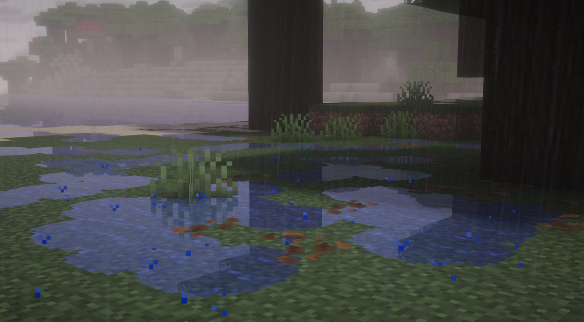 Это все и выглядит очень красиво, особенно с шейдерами (автор мода советует использовать шейдеры Complementary), да и в целом реалистично и атмосферно становится в мире с этим модом. Лужи могут быть как с один блок, так и до 2х2 и 3х3 блоков размерами.