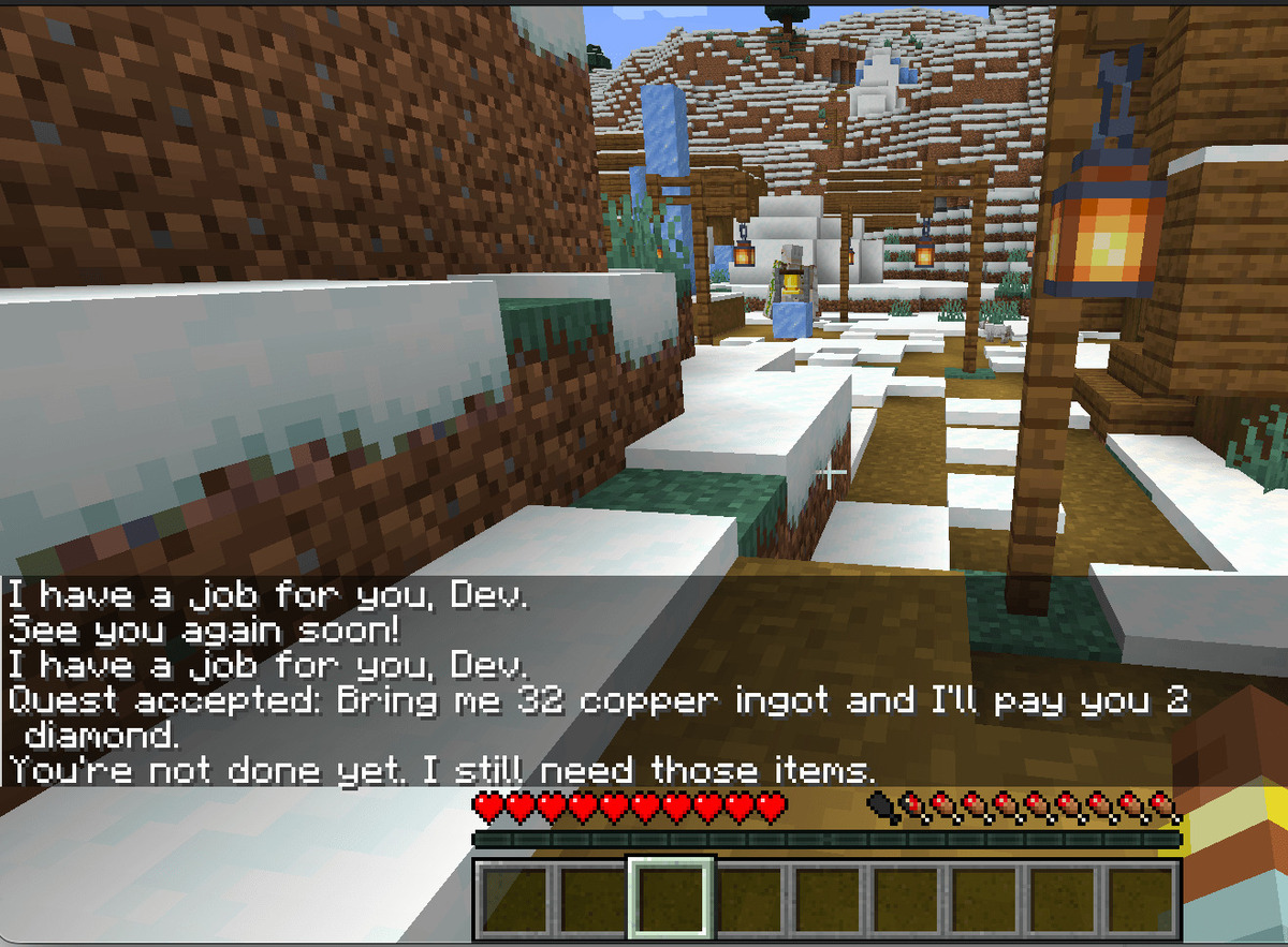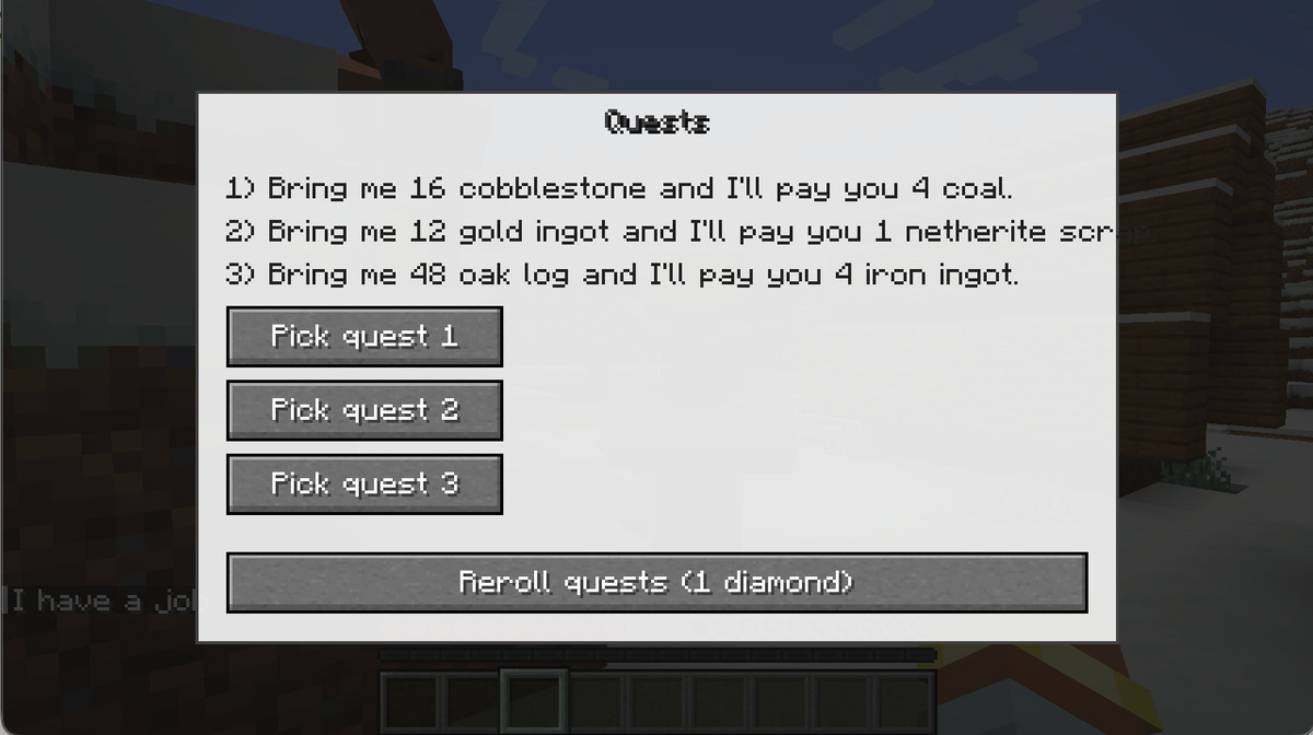 Мод добавит в майнкрафт жителя, у которого можно будет взять квест и получить награду за его выполнение. Стоит к нему подойти близко и он сам в чат напишет, что для игрока есть задание. При взаимодействии с ним выйдет меню, где можно будет взять один из трех квестов. Квесты хоть и простенькие по типу принеси-подай, но все равно приятно выполнить их и получить редкие предметы.