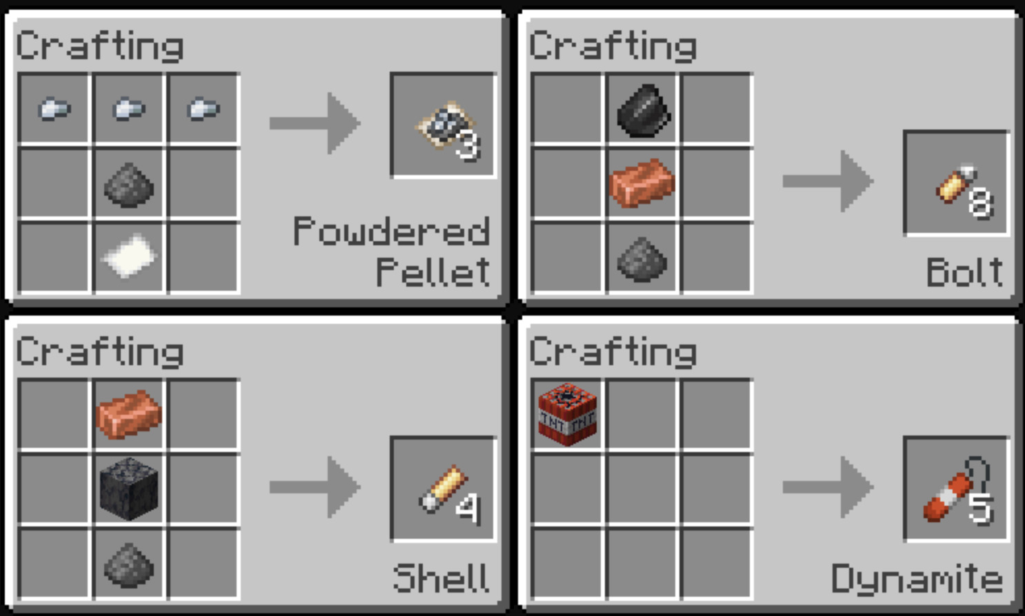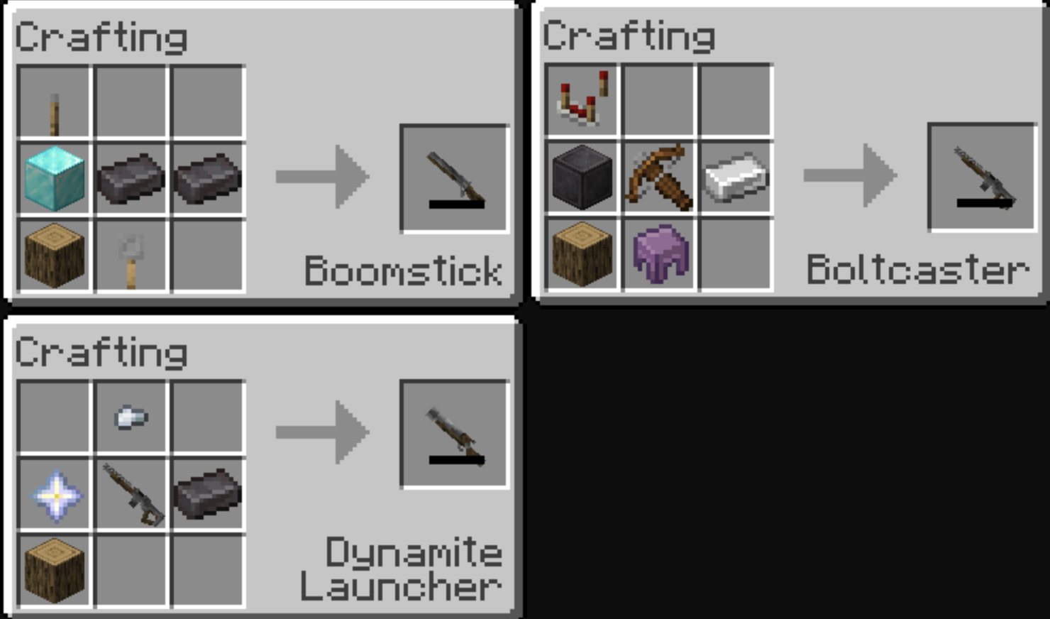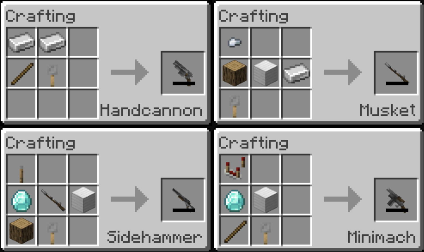 Мод добавит в майнкрафт семь видов оружия - обычный револьвер, мушкет, обычные ружье, пистолет-пулемет, двухстволка, автомат и пушку для запуска динамита. Каждое из них обладает сильными и слабыми сторонами, из-за чего является уникальным. Пистолет подойдет для любой ситуации, но урон маловат, а двухстволка обладает огромным уроном, но только на коротком расстоянии и так далее. Для каждого оружия еще нужно патроы, которые нужно будет предварительно скрафтить.