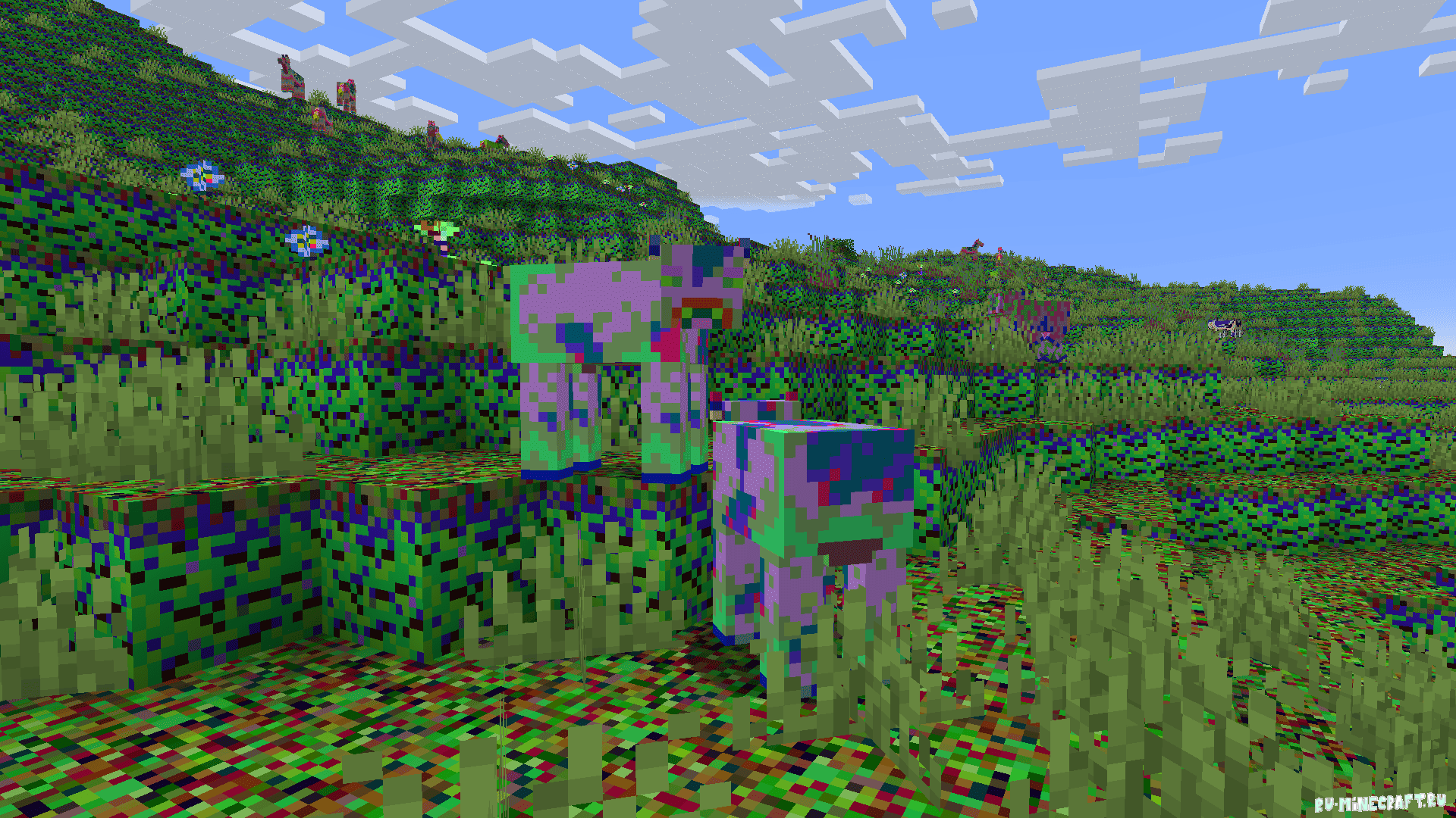Очень интересный ресурспак, случайно заменяющий каждый цвет везде, кроме интерфейса. Имеется ввиду, что какой-либо оттенок заменён единожды, и во всех текстурах, где он встречается, он будет выглядеть одинаково. Атмосфера игры с такими текстурами изменится кардинально, а в какую из сторон - лучшую или худшую, - решать уже вам.