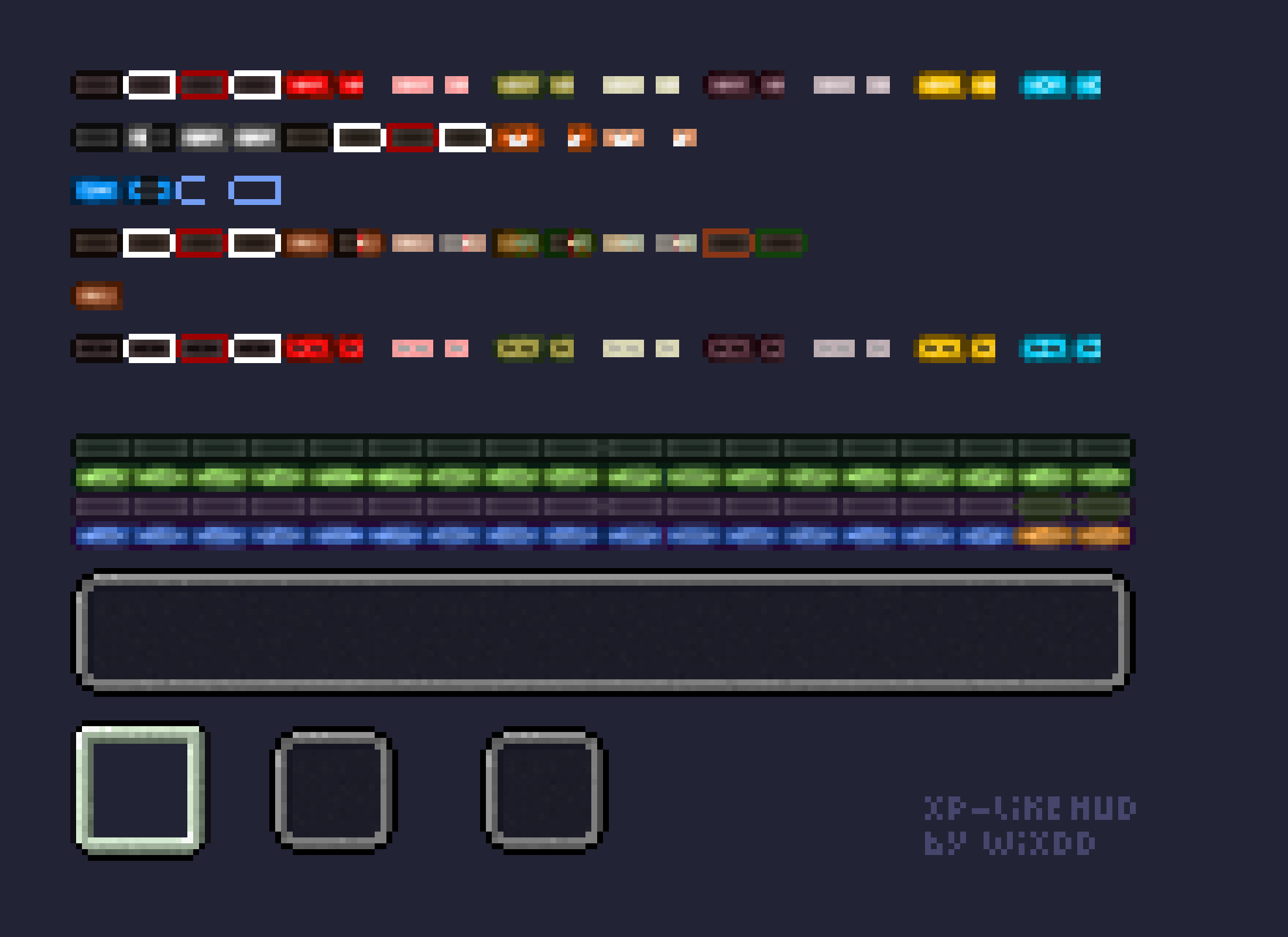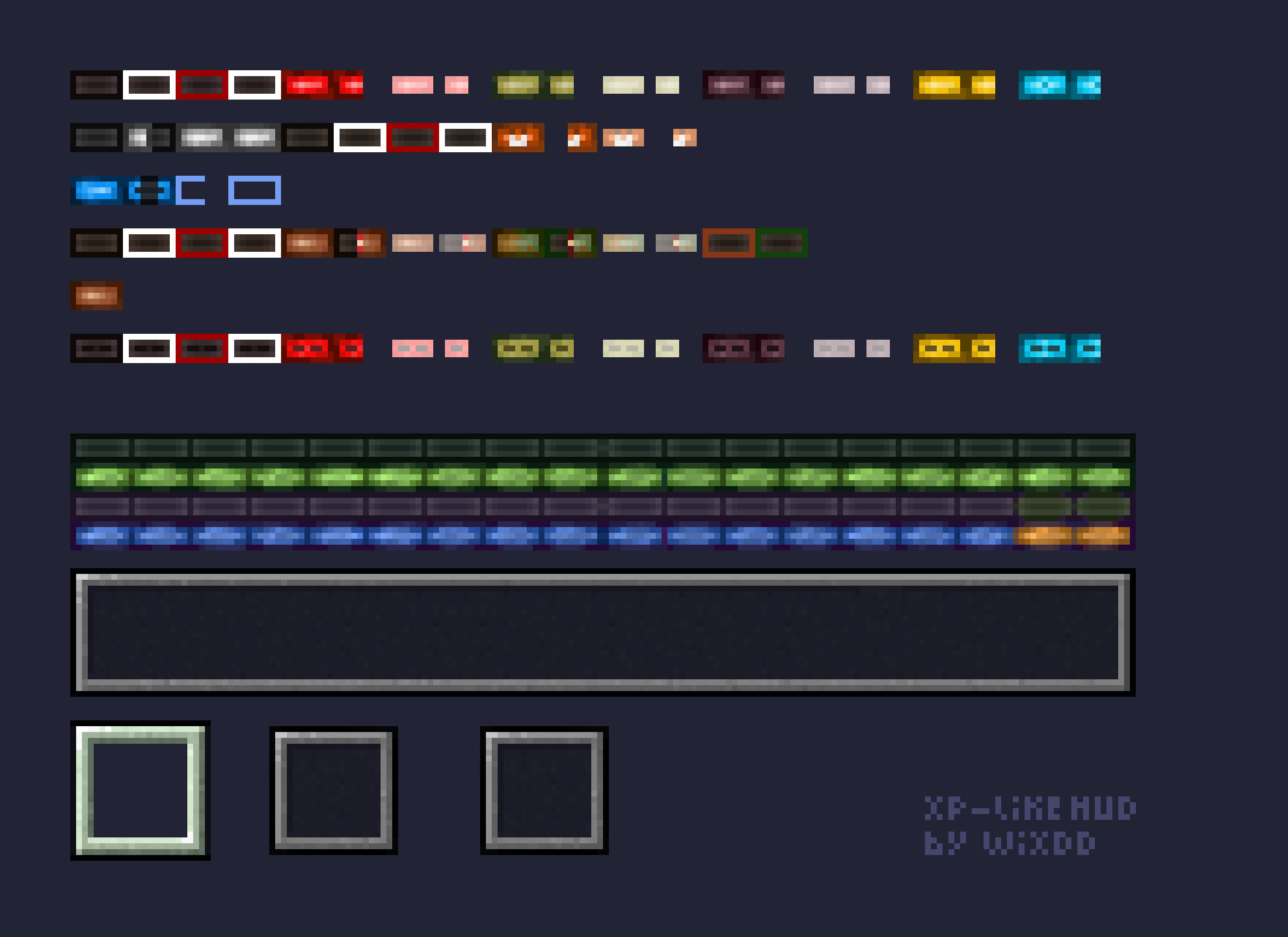 Ресурспак изменит весь худ игрока (менюшки со здоровьем, броней, голодом, запасом воздуха, опытом, вещами и другим) на стиль, в котором сделана полоска с опытом в игре. Есть две версии текстур - с отсрыми и закругленными углами. Ресурспак поддерживает также кучу модов, что является большим плюсом.
