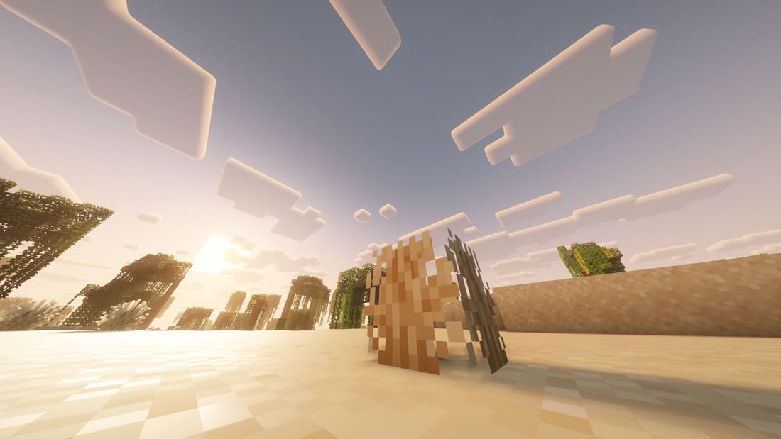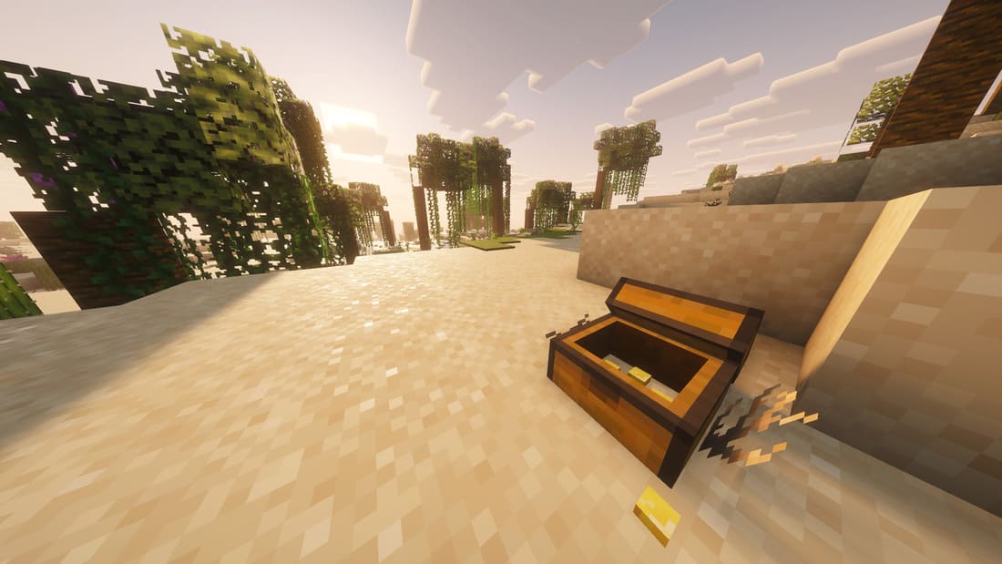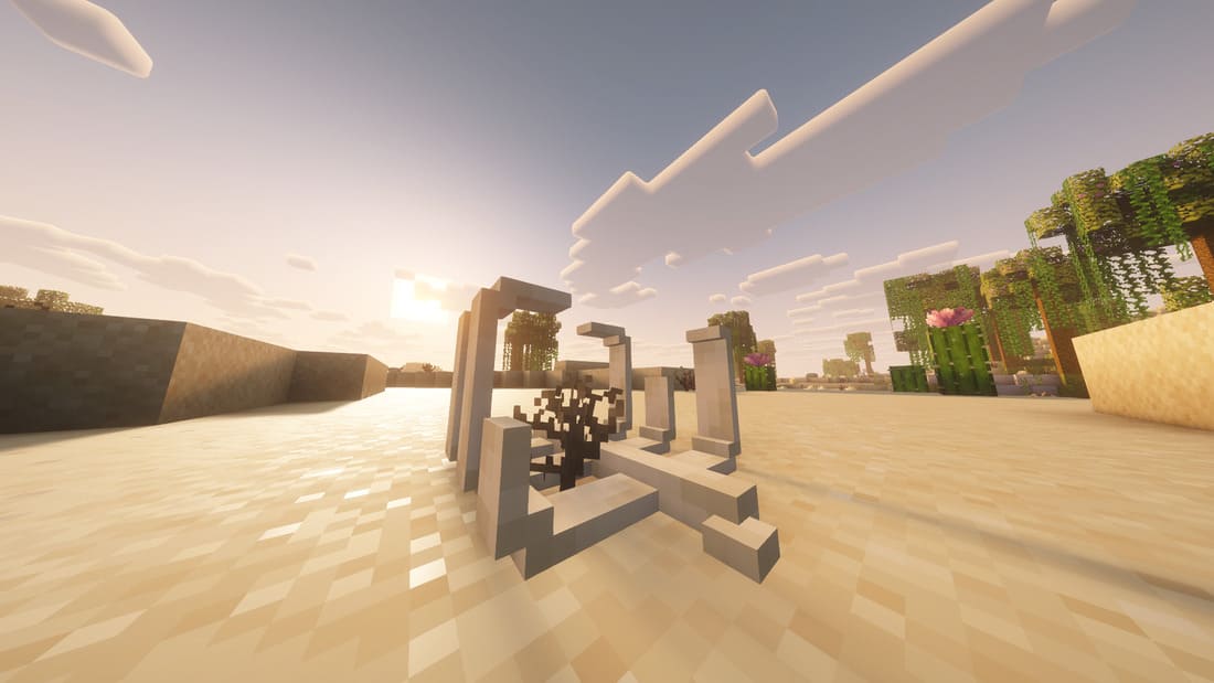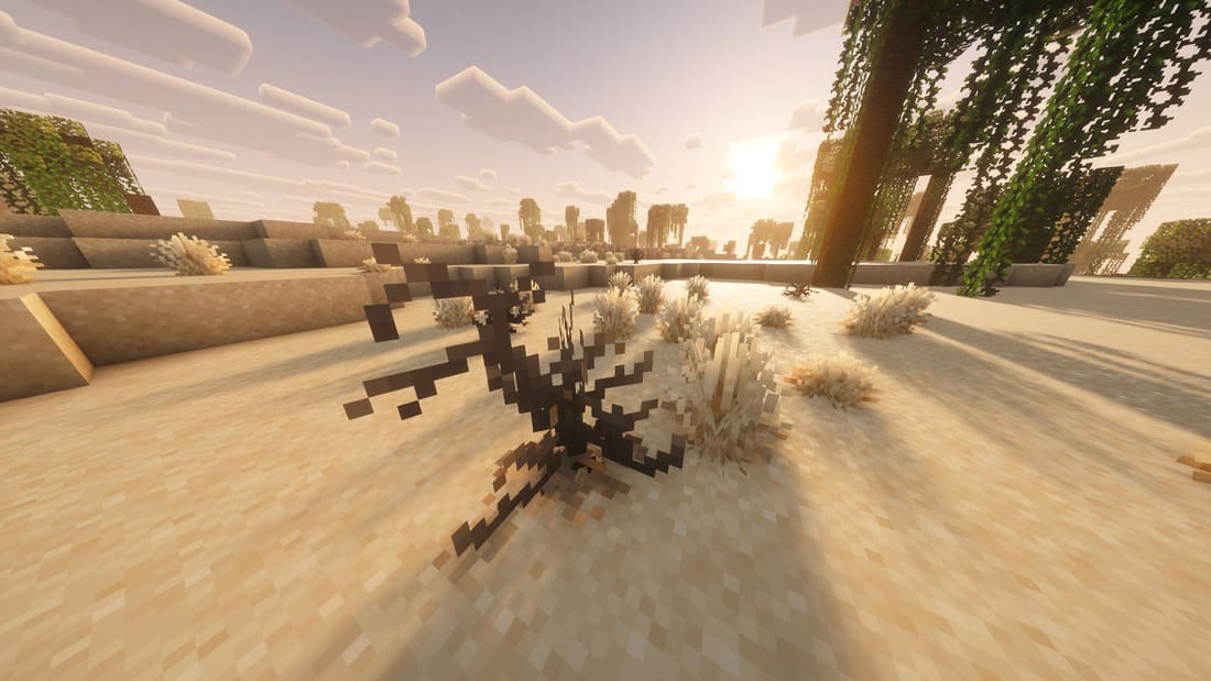 Ресурспак делает пустыню в майнкрафте гораздо более атмосферным и разнообразным местом. Когда-то тут была бурлящая жизнь, а теперь остались только перекати-поле, высохшие без воды кусты, останки от животных - иногда можно найти ребра, иногда голову, а иногда всё вместе, разрушенные и опустошенные сундуки и другие вещи.