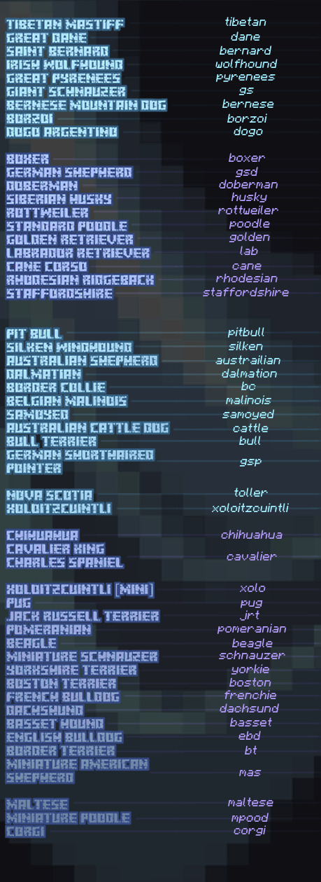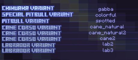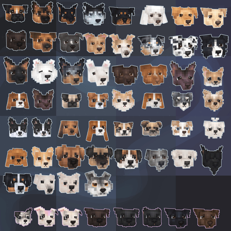 Мод добавит в майнкрафт возможность вместо обычного волка сделать себе собаку, причём их очень много видов - больше пятидесяти штук. Каждую из них можно сделать себе вместо волка путём переименования его на одно из имён, что указаны на последних картинках в галерее. Выглядят модельки и текстуры у новых видов собак очень хорошо - они отлично смотрятся среди дефолтных текстур.